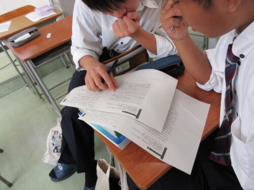 1つ目の講座は、2024年度から新たに英検に導入された要約問題についての対策講座です。英語長文を英語で要約する方法を学んだうえで、自分で問題を解き、友人と答案を交換しながら「こんな表現も使えるんだ」と新たな発見をしていました。先生からは難易度に応じた模範解答も示され、自分の答案と見比べながら書き直すことで、一人ひとりの答案がより完成度の高いものになっていきました。