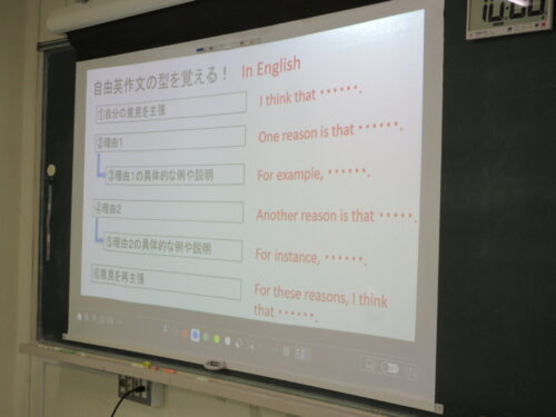 2つ目の講座は、リスニングと自由英作文の対策講座です。リスニングでは「どんなことに焦点を当てて聞くべきか」をあらかじめ例題で理解した後、集中して問題に耳を傾ける練習をしました。自由英作文では、まずブレイン・ストーミングで意見を出し合い、その後に段落構成の基本的な型を学びました。その型を意識して、論理的に自分の考えを組み立てていく中で、生徒たちは「書けた!」という達成感を得られた様子でした。