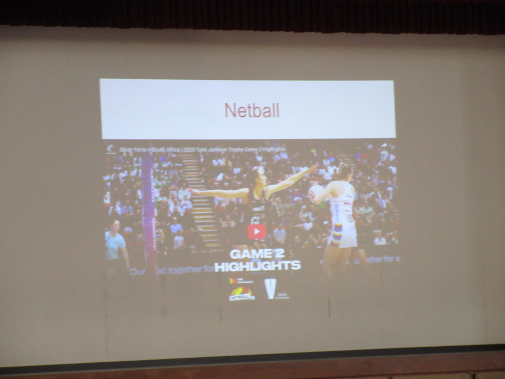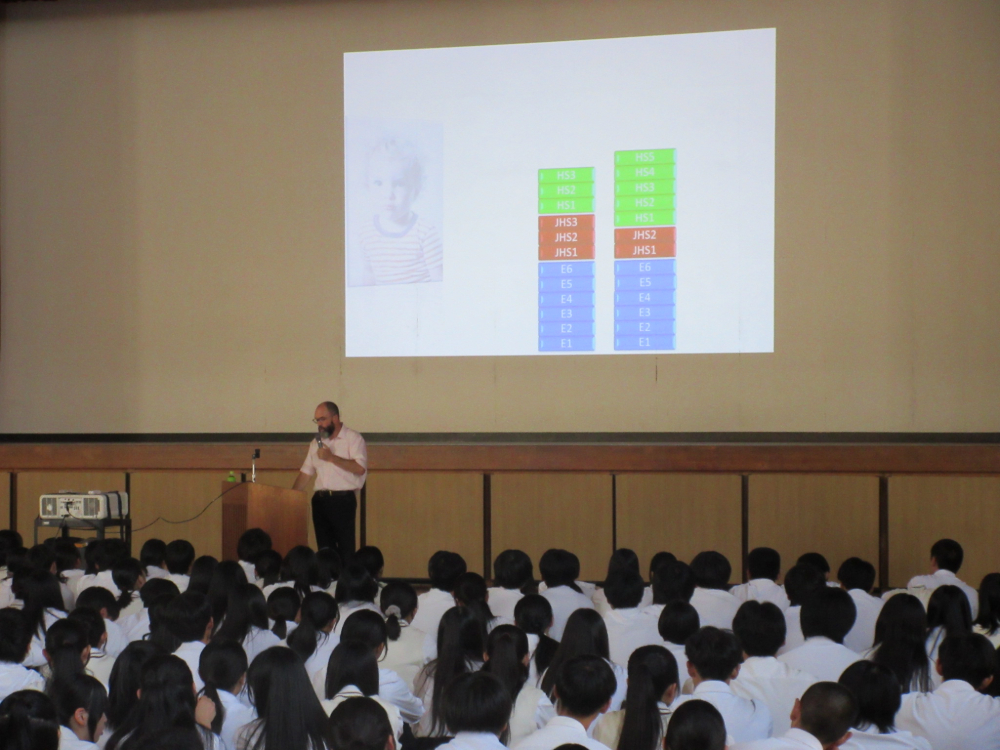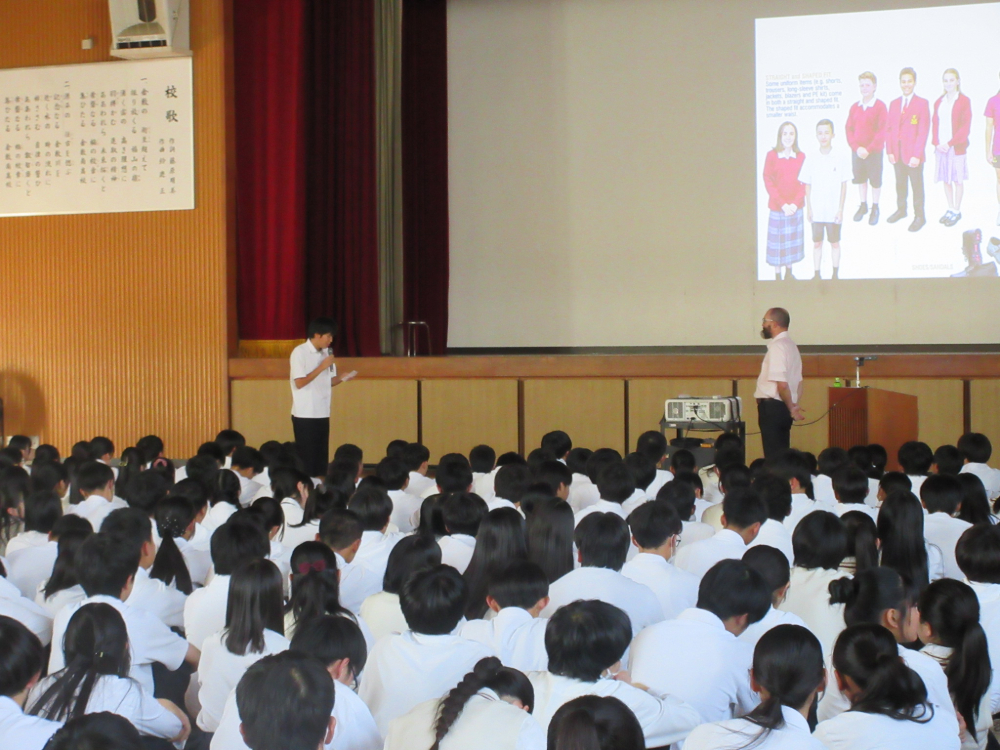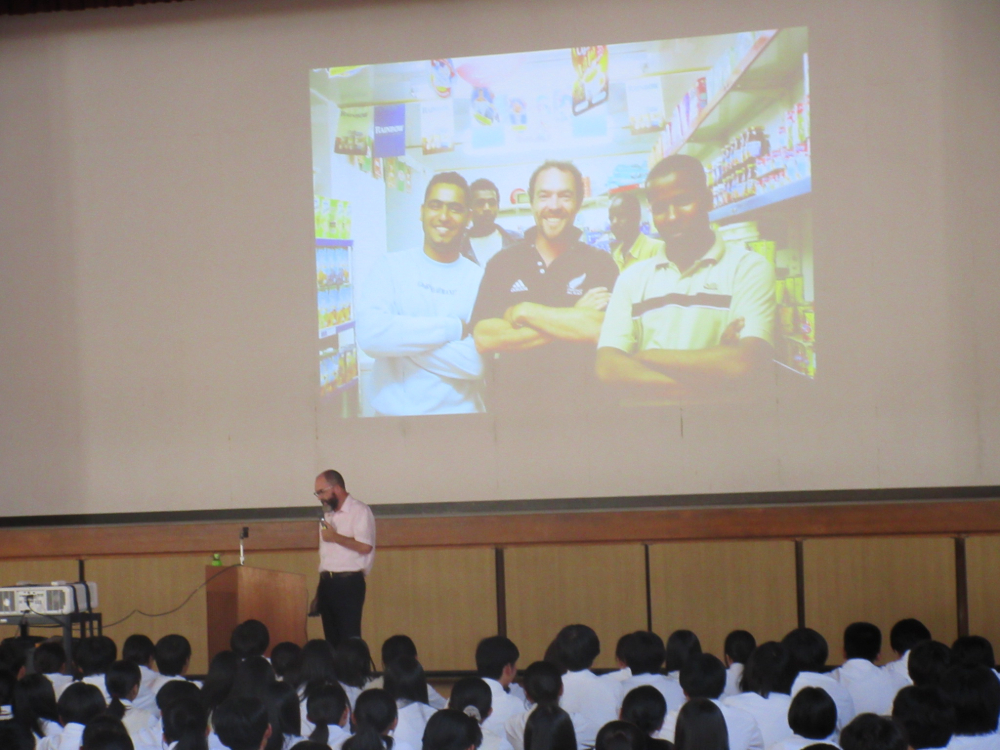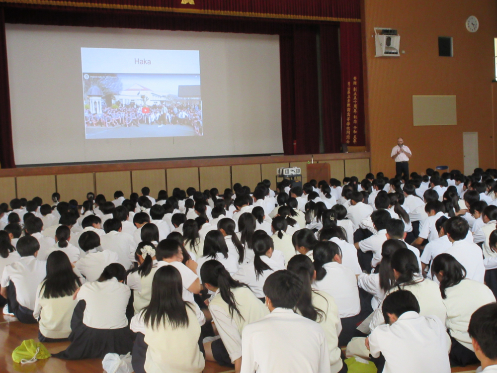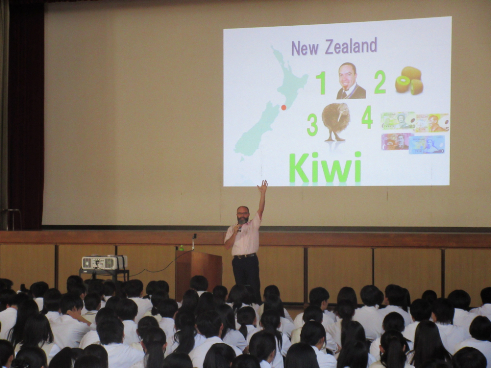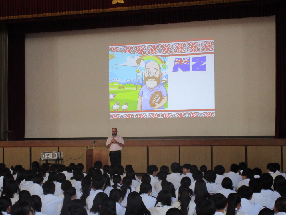 ニュージーランドご出身のベンソン先生は、ニュージーランドと日本の違いを様々な視点から紹介してくださいました。小学校から高校までの学年の数え方が違うことや、高校には日本以上に多くの部活動が存在すること、また、校舎の特徴として、建物自体が低かったり、芝生のグラウンドがあったりすることを知りました。言葉が通じなくても、ジェスチャーや簡単な英語で話題が広がることなど、ご自身の体験を踏まえたお話に、生徒も大きな刺激を受けました。