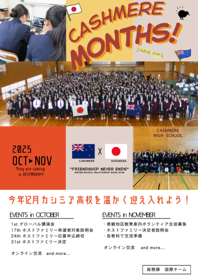 2年ぶり、いよいよ今年12月に、姉妹校であるカシミア高校から14名の高校生が倉敷南高校にやってきます。10月〜11月は「CASHMERE MONTHS」(カシミア月間)と称し、様々な企画が予定されています。