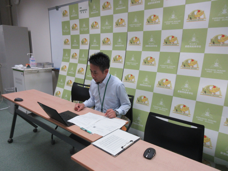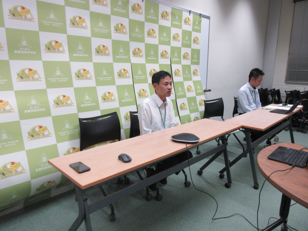 本校教頭からの開会挨拶ののち、岡山県教育委員会委託の「留学コーディネーター」であるJTBのスタッフの方からホームステイ受入における基本的な心構えのお話、また本校総務課長から受入日程や応募方法に関する説明がありました。
