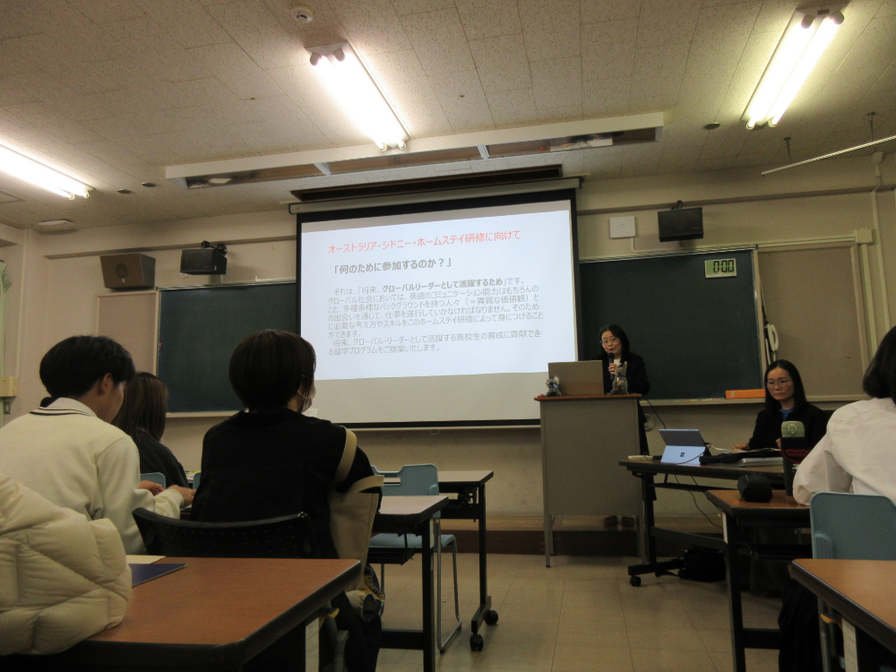 投稿日:2025年10月28日(火曜日)10月24日(金)18:00~19:00、本校の合併教室にて、来年3月末に実施予定の本校主催「オーストラリア・シドニー海外語学研修」希望者対象説明会を行いました。本校1・2年次生34名とその保護者の方々が参加してくださいました。