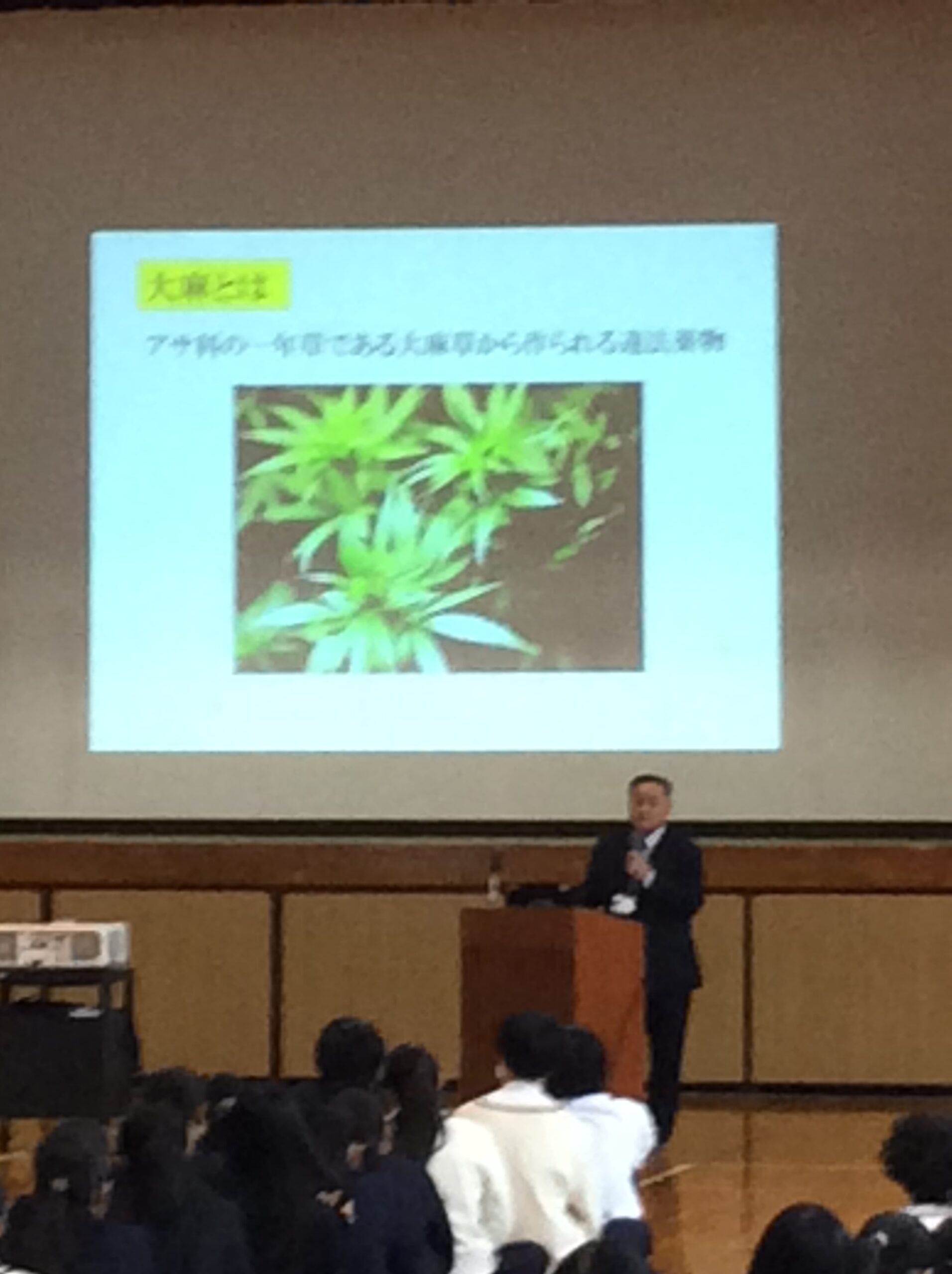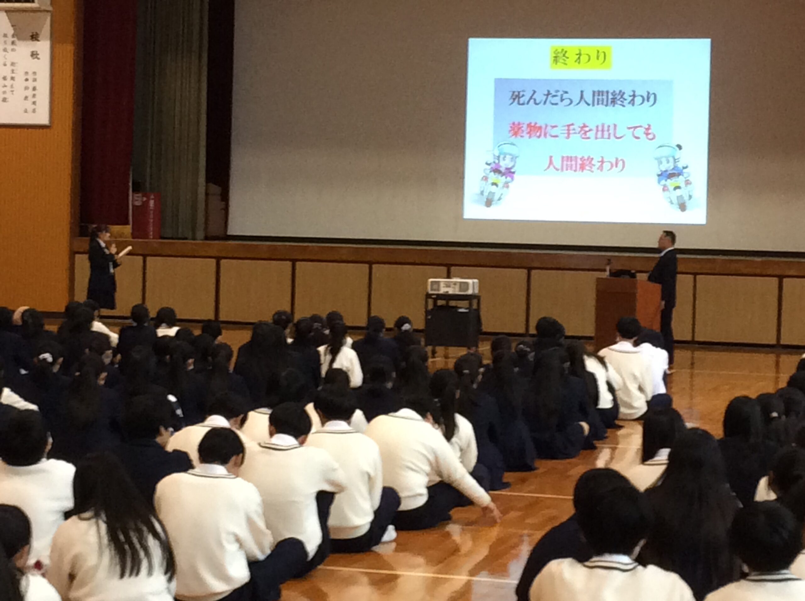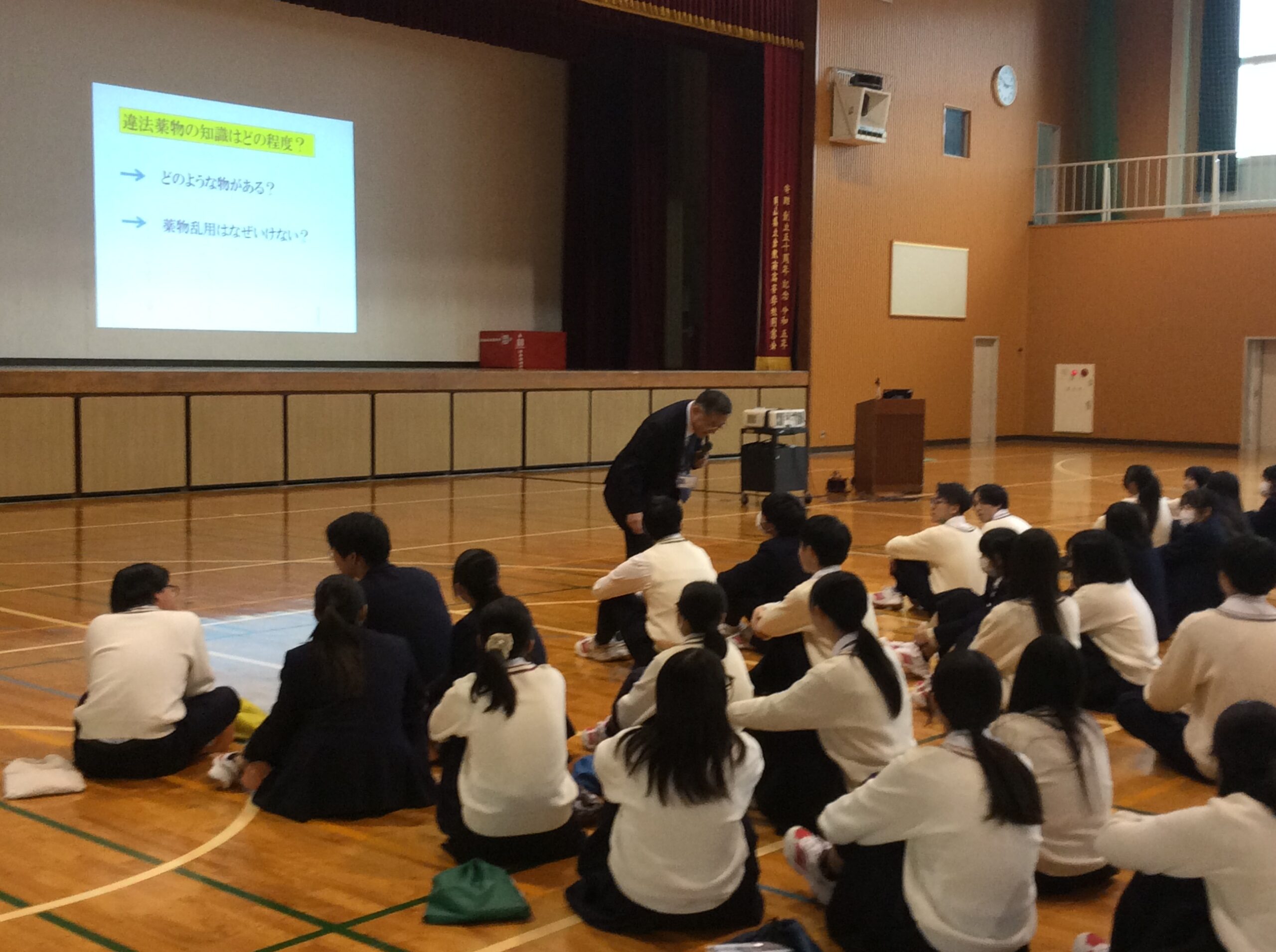 香山様は、近年特に10代・20代といった若年層において増加している薬物中毒の実態、有害性等について、DVDの視聴や生徒への質問を交えて詳細に説明されました。先輩や友人から誘われるケースが多いということもあり、3年次生も自分ごととして真剣に考え、聴き入っていました。最後の生徒代表の挨拶では、受験勉強の中でストレスを抱えることがあっても薬物に関わることなく自律的に生活していくという強い決意が述べられました。