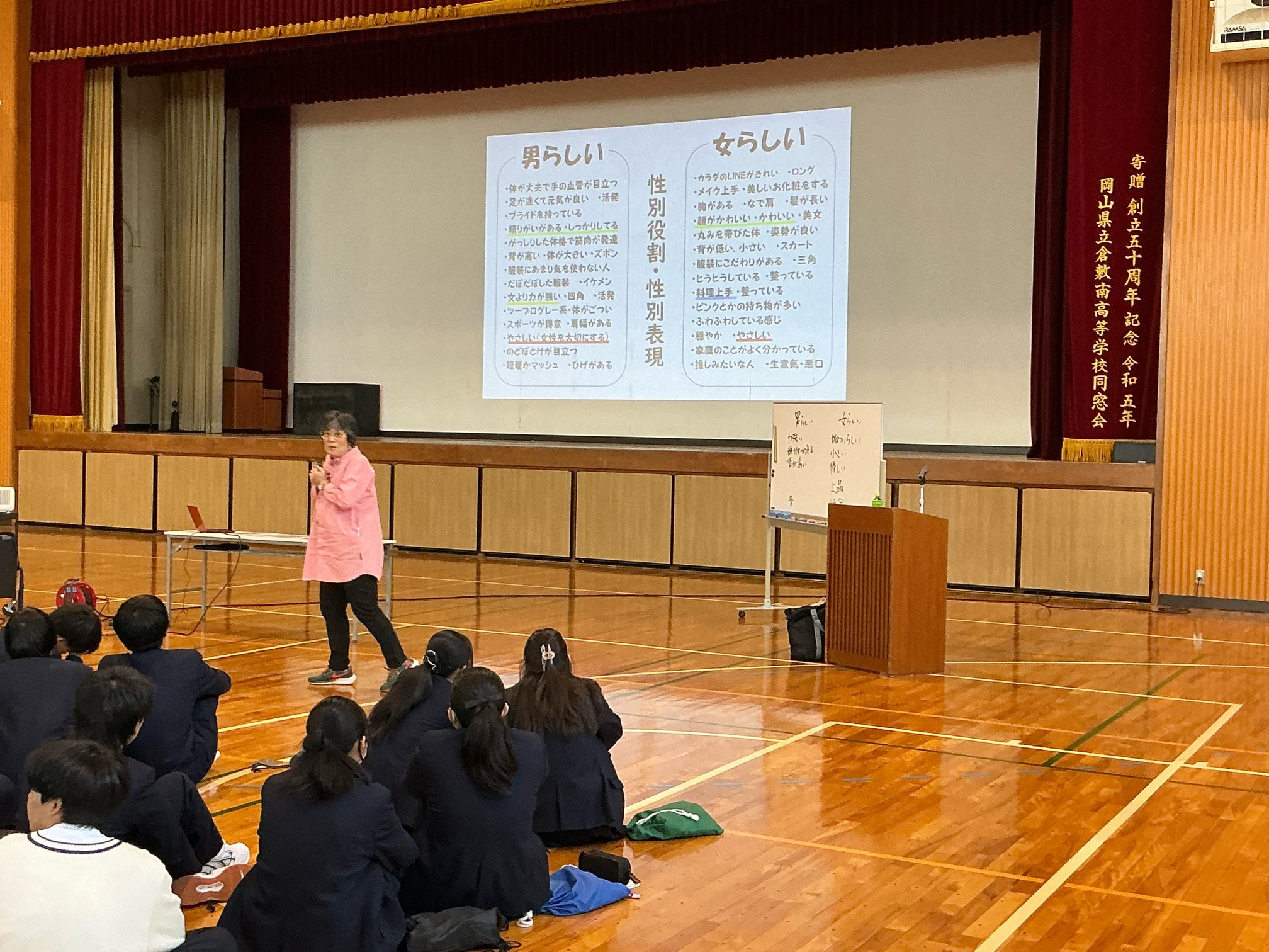 投稿日:2025年11月21日(金曜日)11月19日(水)、1年次は「だいじょうぶらぼ」の 爲清 淑子(ためきよ よしこ)先生をお招きして「大切ないのち 大切なわたし」というテーマで性教育講演会を開催しました。生殖器のことやLGBTQ、デートDV、性感染症等について学びました。男らしさとは?女らしさは?という質問を投げかけ、先生自ら生徒の中を回って、直接意見を聞いてくださいました。生徒からは「G7の国の中で日本だけ同性婚が認められていないことに驚いたが、倉敷市にパートナーシップ制度があると知れてよかった」や「性に対して様々な考え方があることを知った。柔軟な考え方を身につけたい」といった感想を聞くことができました。大変良い学びとなりました。爲清先生、ありがとうございました。