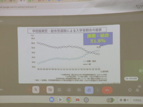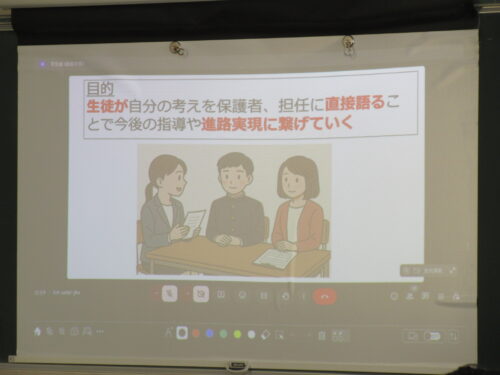 投稿日:2025年12月6日(土曜日)2年次では、12月5日(金)にオンラインで年次集会を行いました。2年次では12月25日(木)から始まる保護者懇談で、懇談では、生徒が保護者とともに懇談に在席し、自身の志望校や今後の学習について主体的に話をしてもらうことになっています。それを通して、先生や保護者が生徒の思いを共有し、よりよい進路選択につながる前向きな相談ができればと考えています。