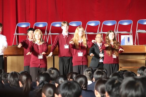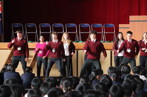 吹奏楽部がニュージーランド国歌を演奏する中、ホストスチューデントと一緒にカシミア高生が入場しました。それから、校長先生・生徒会長が英語で歓迎の言葉を述べました。吹奏楽部の歓迎演奏がさらに歓迎ムードを高めました。その後、カシミア高生は緊張の面持ちでしたが、一人ずつ日本語で自己紹介をし、カシミア高校独自のハカを全員で披露してくれました。ハカはニュージーランドのマオリ族に伝わる伝統的な踊りで、各校で違うそうです。体育館の床が大きく振動する力強い動きに、南高生は圧倒されました。それに応えるように、南高生は校歌を全員で披露しました。最後に両校生徒の集合写真を撮って歓迎式を締めくくりました。