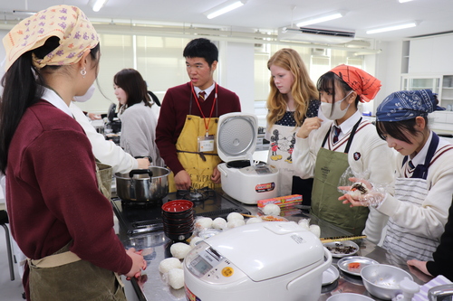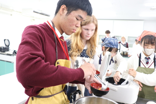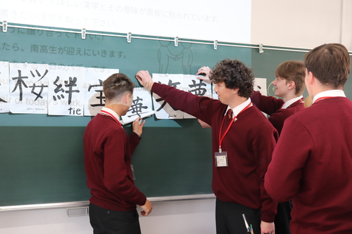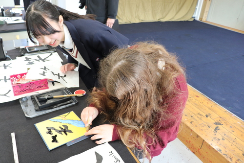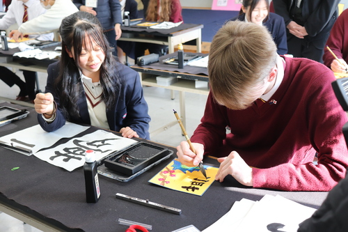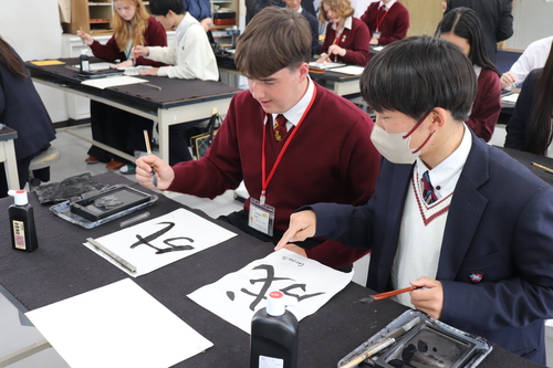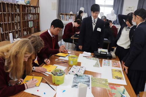 歓迎式の後は、日本文化に関係する授業を体験しました。『美術(日本画)』『書道』『家庭科』です。美術と書道では、日本風の絵を参考に金屏風に絵を描き、書道では漢字の意味から好きなものを選んで、同じ屏風に漢字を書き足しました。書道をやったことのある生徒がいたり、初めてで姿勢と筆の持ち方から初めての体験したり、楽しい時間になりました。また、美術でも書道でも本校の生徒が先生役として、英語と日本語とジェスチャーを交えながら一生懸命、考えを伝えようと頑張っていました!