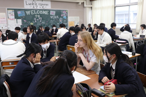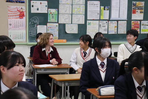 午後は1,2年次の通常授業に混ざって、倉敷南高校の授業体験です。カシミア高生が、それぞれのホストスチューデントのクラスに入って、異なる授業を体験しました。熱心に勉強する、普段の南高の様子がわかったのではないでしょうか。