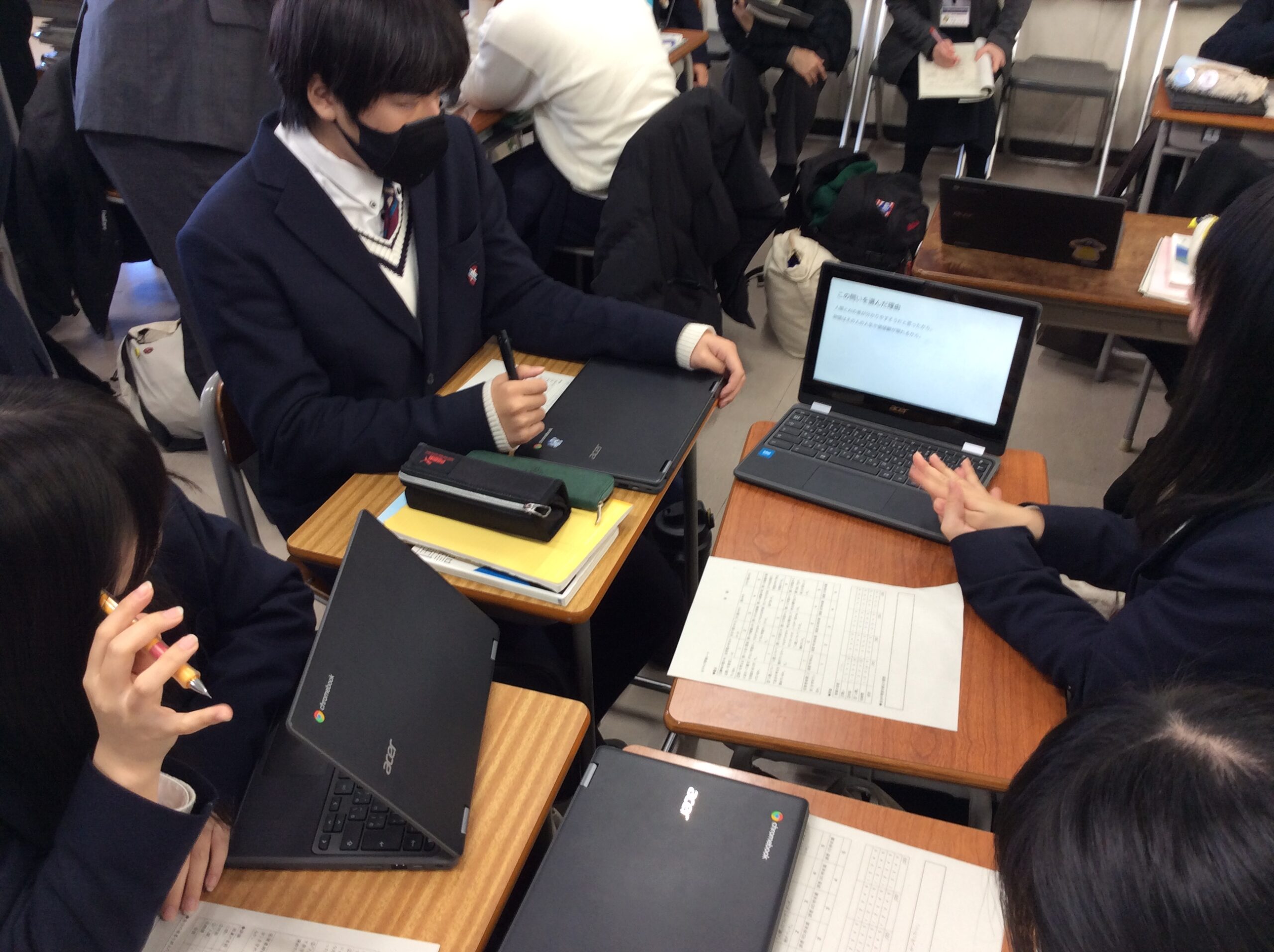 研究授業では、「QFT=Question Formulation Technique」(質問づくり)を中心に据えて各教科で研究してきた成果を代表教員が実践しました。どの授業にも、授業者が提示した「質問の焦点」をもとに生徒が作成した質問をグループ・クラスで共有する活動が含まれていました。理科では質問づくりを概念の理解へと発展させる学習活動、外国語(英語)では読解した内容を踏まえて新たに質問を作り思考を深める学習活動、国語では自分の考えを深めるために作成した問いを検証し他者に説明する学習活動、情報では既習事項を活用して生徒自身がテストの問題を作成する学習活動が行われました。