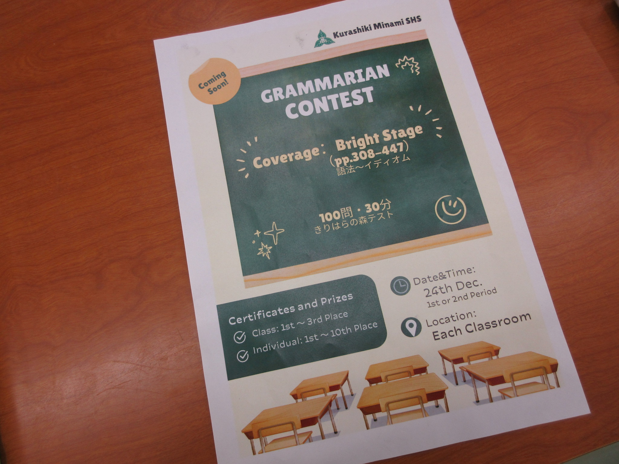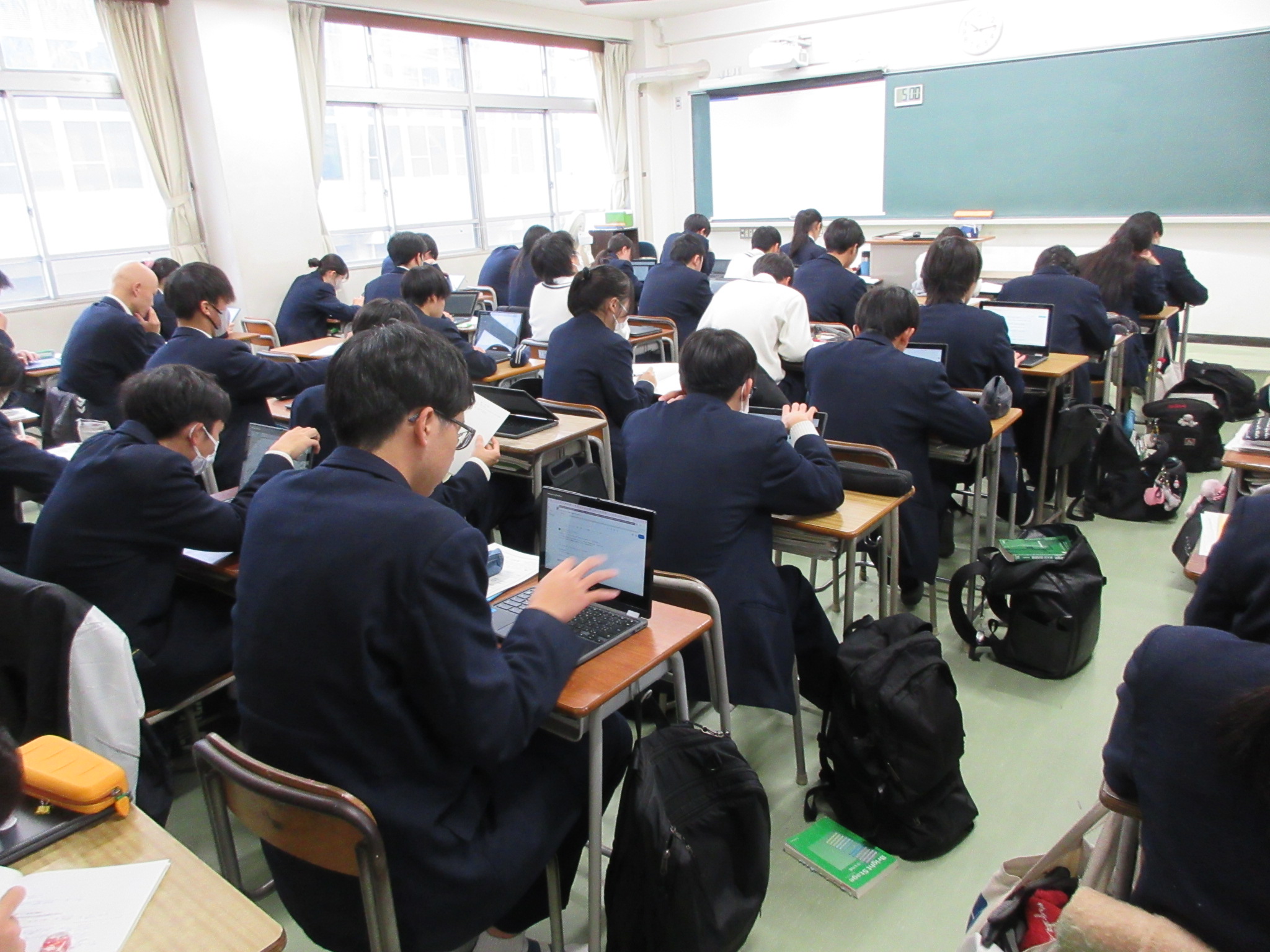 投稿日:2025年12月25日(木曜日)12月24日(水)に、2年次では英語科によるThe Grammarian Contestを実施しました。夏の第1回に引き続き、第2回目となりました。The Grammarian Contestでは、英文法の4択問題を100問出題し、それを各生徒にクロムブック上で解答させるコンテストです。普段から英語の授業で使っている英文法の問題集から出題しました。今回の範囲は約400問。そのうち100問をテンポよく解答してもらいました。30分の制限時間で100問。1分で3〜4問を解答する計算になります。