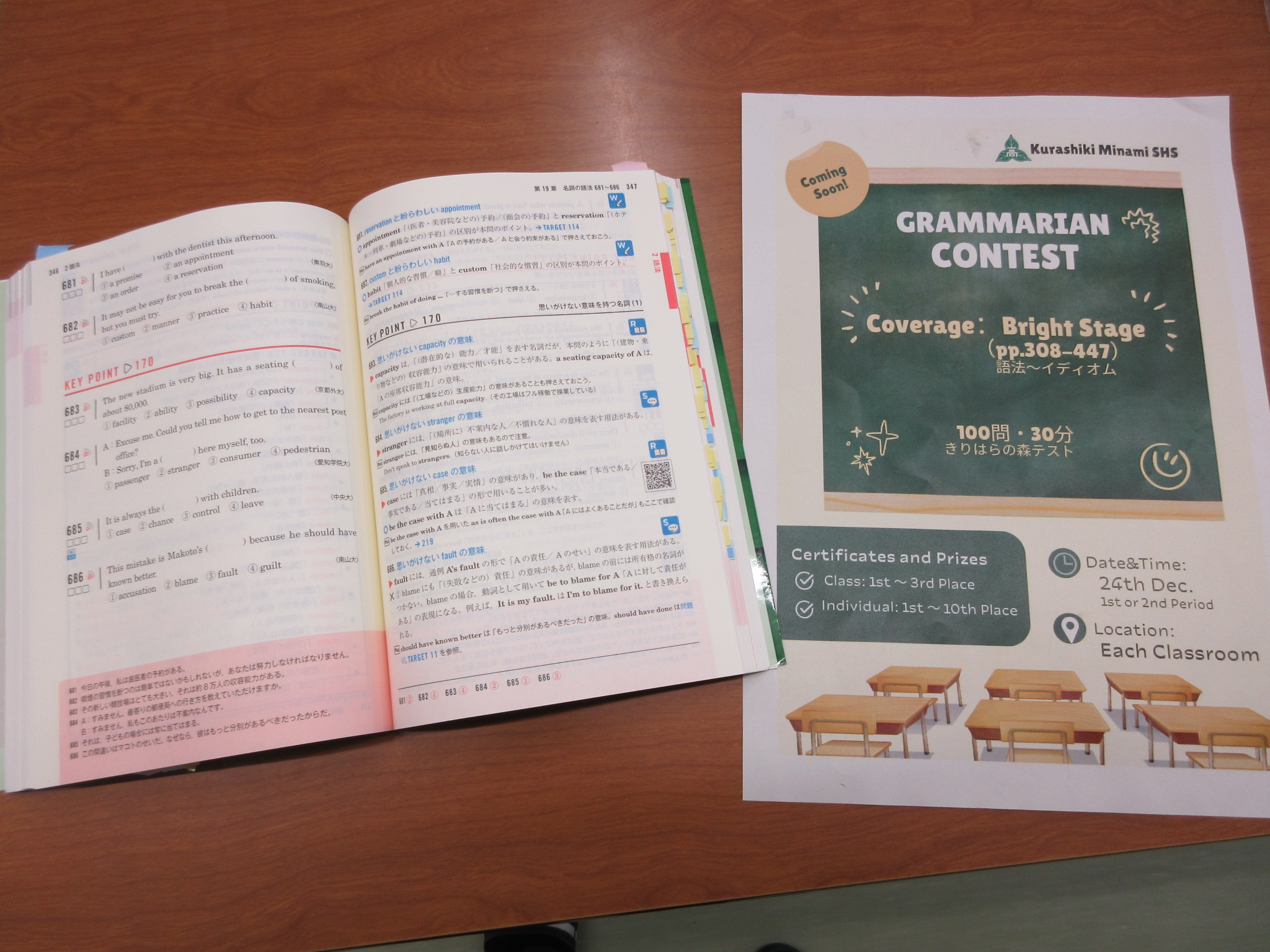 このコンテストの目的は、日頃の英文法学習の定着度合いをはかることです。今回のコンテストで、よくできた生徒は、基礎が固まりつつあります。ぜひ英語に自信を持ってください。いまいちできなかった人は、これを機に英文法の見直し・復習を始めましょう。次回は3学期末に実施予定です。
