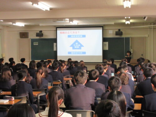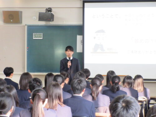 また、校長先生の講話に続いて、年次主任の先生からも生徒の皆さんに向けた激励の挨拶がありました。今年の大河ドラマの中で印象に残った言葉として、「自分で道を切り開くしかないんだ」というセリフを紹介し、51期生へエールを送りました。今年を飛躍の一年にしてほしいという力強いメッセージが込められていました。