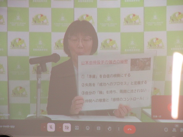 高校生活だけでなく、今後社会で活躍していく中で、メンタルを育てていく必要があるとした上で、ドジャースの山本由伸投手を例に挙げて、山本由伸投手が心掛けている強さの秘訣を紹介されました。