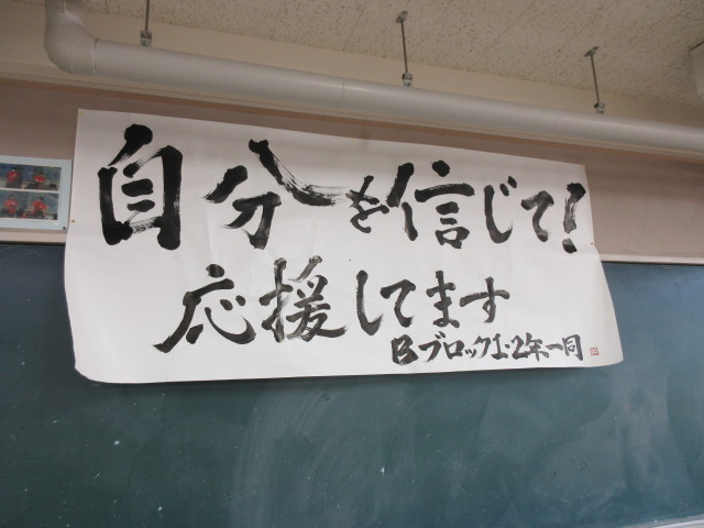 これは、葦岡祭のブロックごとに意見を集約してエールの言葉を選び、それを書道部が書いたものです。3年次の各教室の後方の黒板に飾られています。