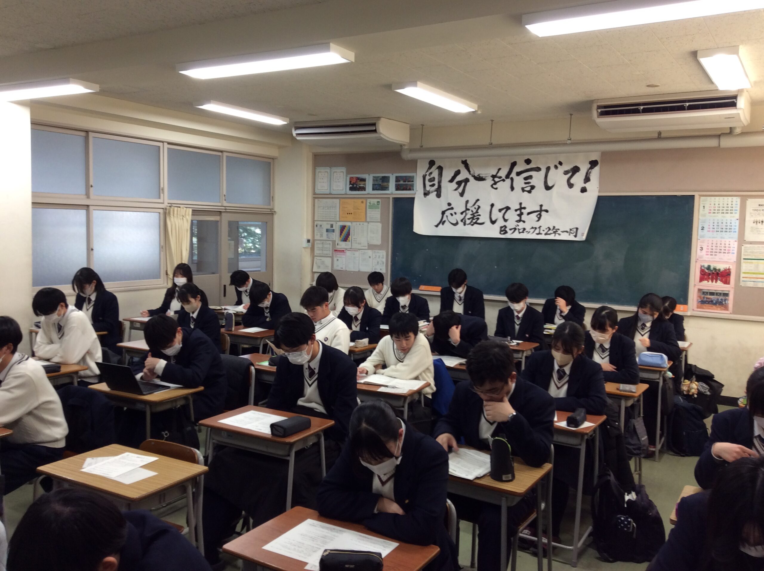 まず校長先生から、「今まで努力してきた自分を信じて乗り切ろう」「緊張感を持てば思考力が高まる」そして今年が午年であることから、「馬力全開で前進しよう」との激励の言葉がありました。続いて進路課長からの挨拶、年次副主任からの受験前後の留意事項についての説明、最後に年次主任からユーモアを交えた「全員合格」を後押しする挨拶で締めくくりました。