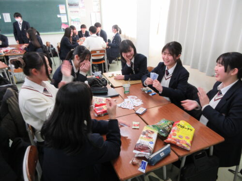 2月4日(水)7限、2年次はクラス独自のロングホームルームでした。各クラスで企画をした内容で、1時間過ごしました。スポーツをしたり、カードゲームをしたり、お菓子パーティをしたりと、クラスメイトとの親睦をそれぞれ深めました。校外模試や実力考査が続いた後の良いリフレッシュになったようでした。生徒はとても楽しそうにしていました。これからも、今日のように笑顔のキラキラした皆さんでいてくださいね。