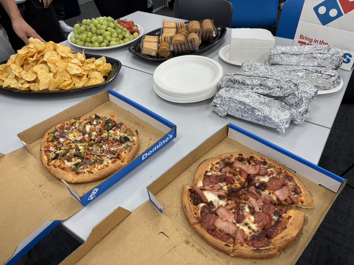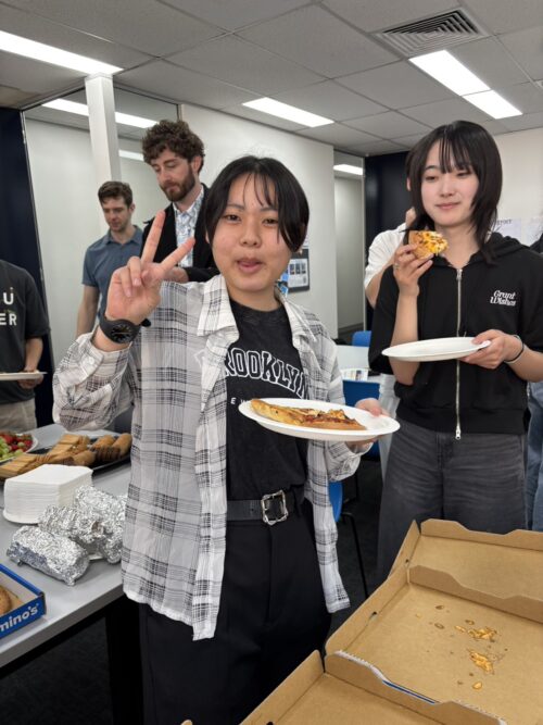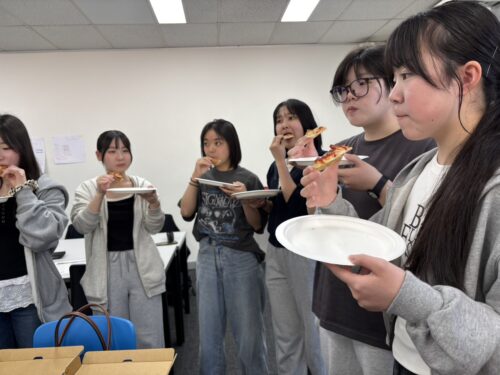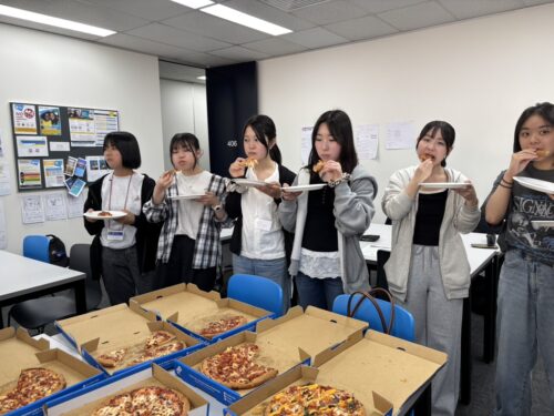 投稿日:2026年4月2日(木曜日)4月2日(木)には、いつもの英語レッスン、Global Citizenshipのレッスンをした後、ランチタイムに語学学校内でピザパーティーをしました。語学学校のスタッフの方が、ピザ・ガーリックトースト・クッキー・ポテトチップス・いちご・ぶどう・ジュースを用意してくださいました。生徒たちは大喜びの様子で、あっという間にほぼすべてを美味しく平らげました。これもオーストラリアでの楽しい思い出の1つになったようです。