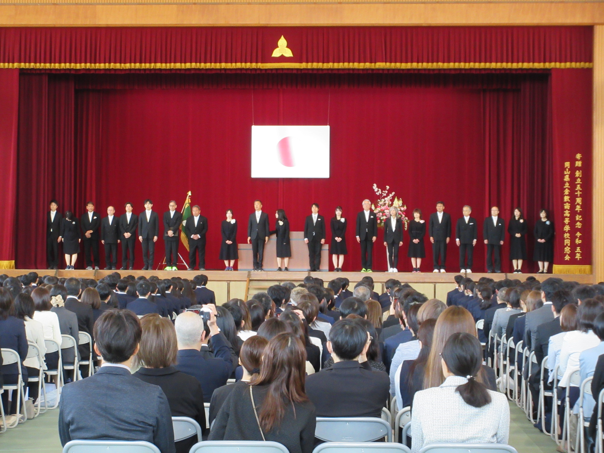 続いてPTA会長の祝辞、新入生代表宣誓の後、1年次団の担任紹介がありました。最後に、新入生たちは倉敷南高校の校歌を初めて聴いて入学式を終了しました。