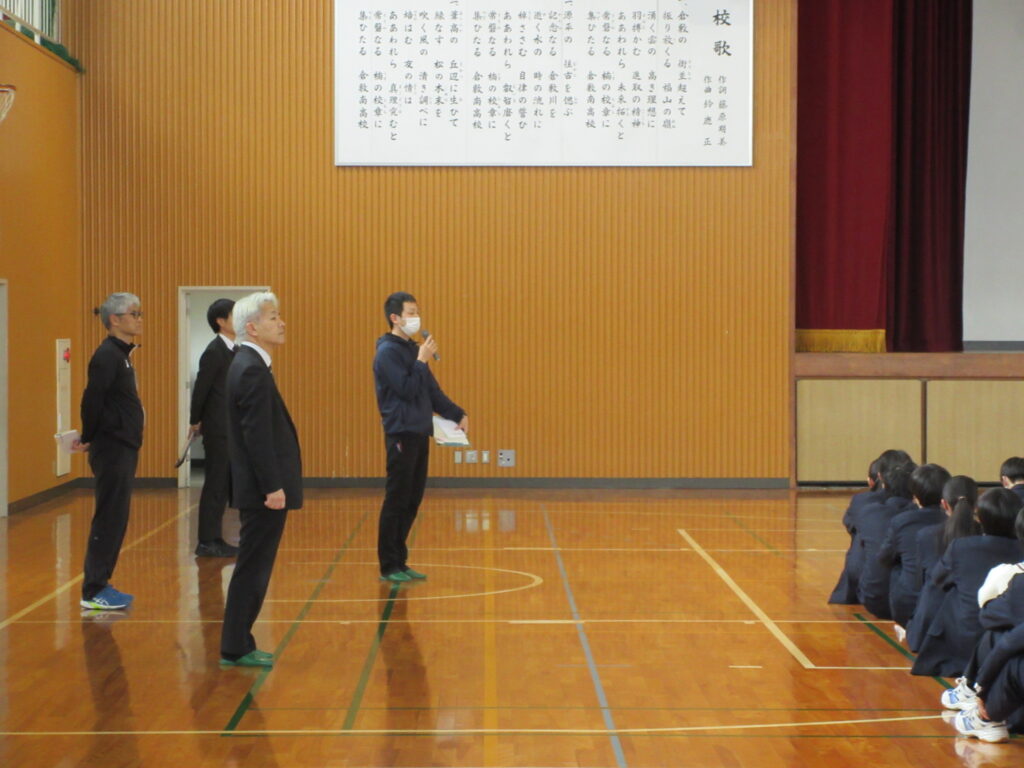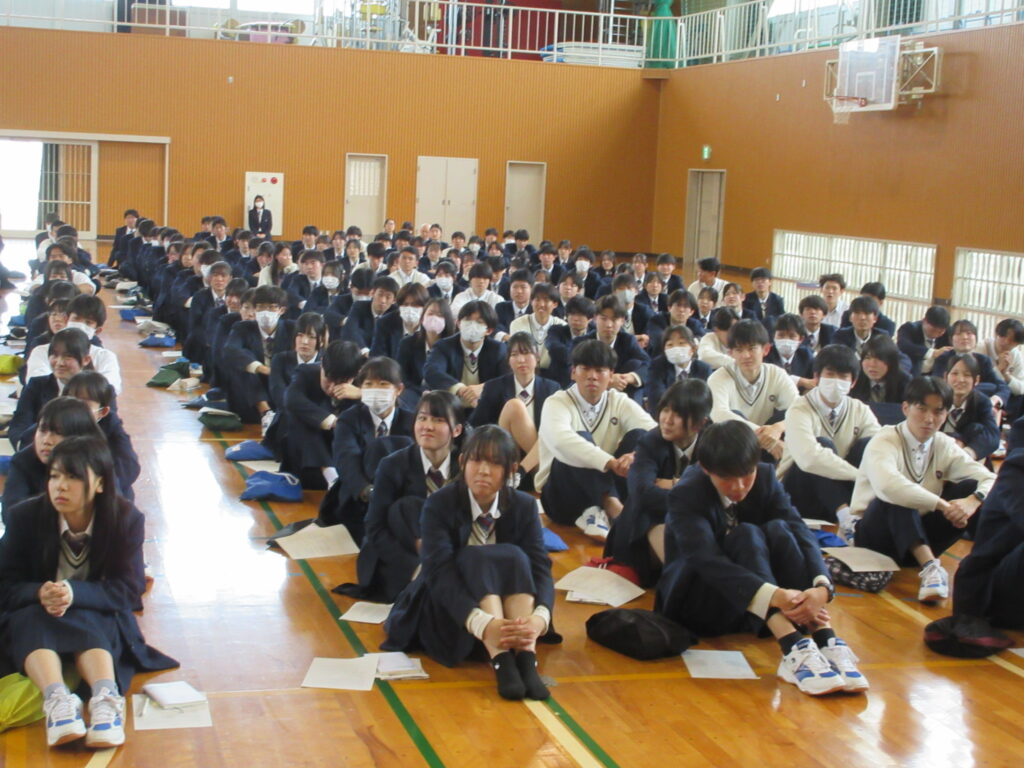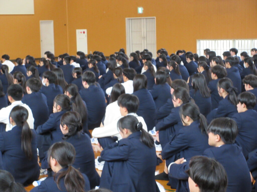 投稿日:2026年4月11日(土曜日)4月10日(金)の7限に、体育館で3年次の年次集会がありました。担任団の紹介、学年主任・副主任の先生方のお話がありました。年次主任は、年次目標の一つ「仁徳」に関わって、挨拶や清掃、先生とのつながりの大切さについて述べられました。副主任は、受験本番までの見通しを、スライドを用いて明解に説明されました。生徒たちは真剣な面持ちでこの一年にかける思いを高めていきました。