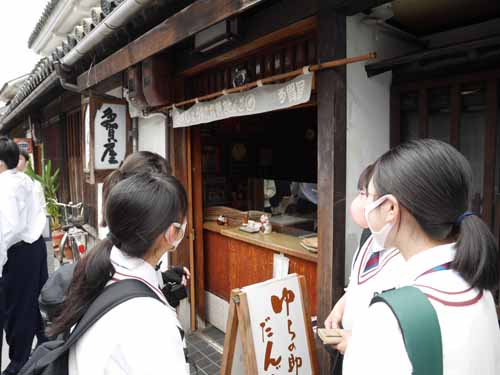 散策の際には阿知神社,鶴形山公園,アイビースクエア,自然史博物館などの地域の名所がチェックポイントになっており,教員から郷土に関する問題が出題され,グループで協力しながら答えを導き出していました。散策をしながら美観地区の新たな一面を発見することができました。